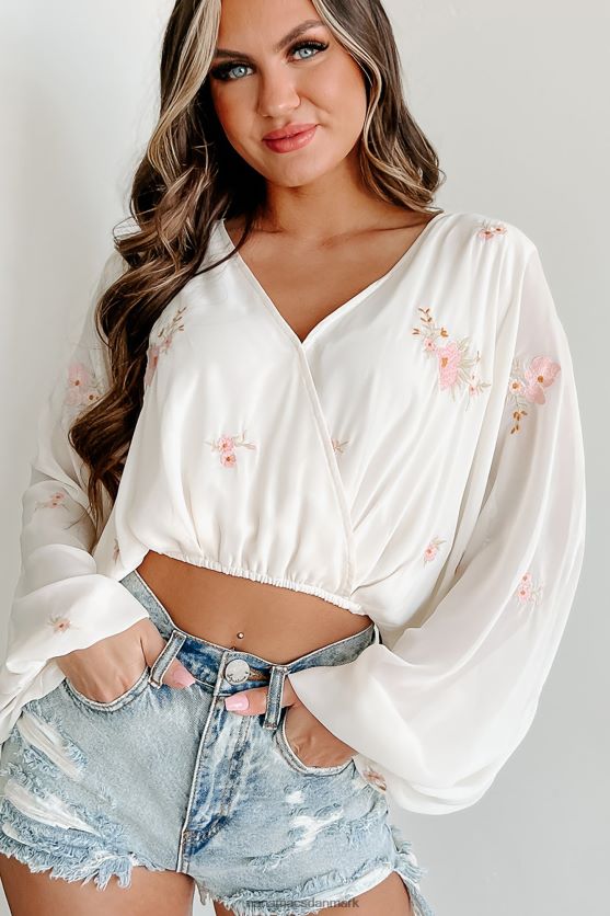 forestil dig at bære en sød cremet top med smukke broderede blomstermønstre. surplice-fronten tilføjer et legende touch, mens bobleærmerne tilføjer volumen til din silhuet. den elastiske kant forneden smigrer din figur, og den afkortede længde gør den perfekt til at kombinere med højtaljede jeans eller nederdele. denne top er ikke bare sød, den er et stykke, der viser din unikke stil!
