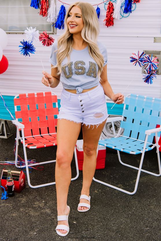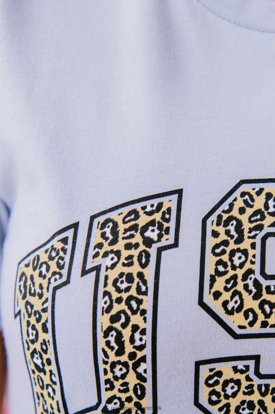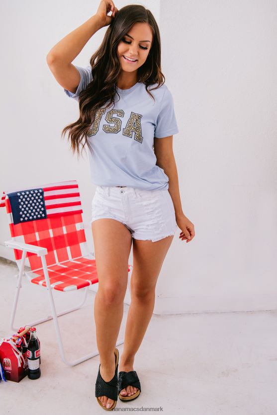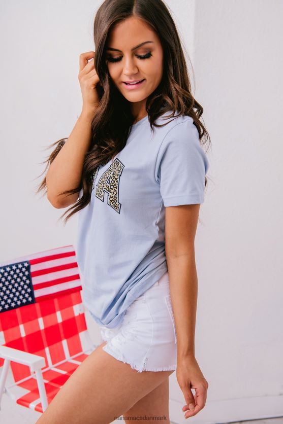 damer, du har ventet på disse søde, lyseblå, leopardprintede usa grafiske t-shirts! skaf dem nu!