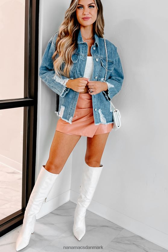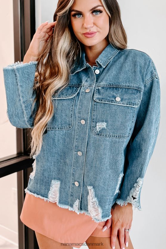 vi vil være ærlige over for dig, denne nødstedte denimjakke skal med dig hjem! de fremhævede detaljer og flossede kanter giver denne jakke en mere vestlig/edgiere følelse!