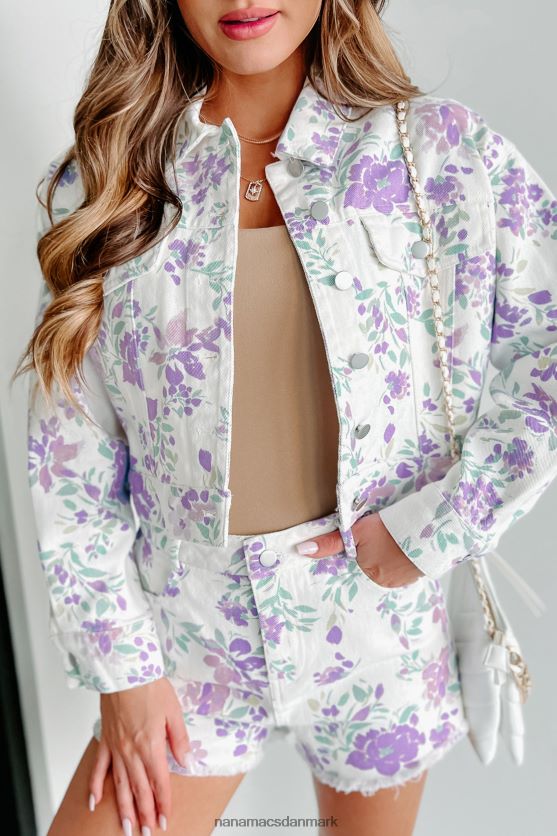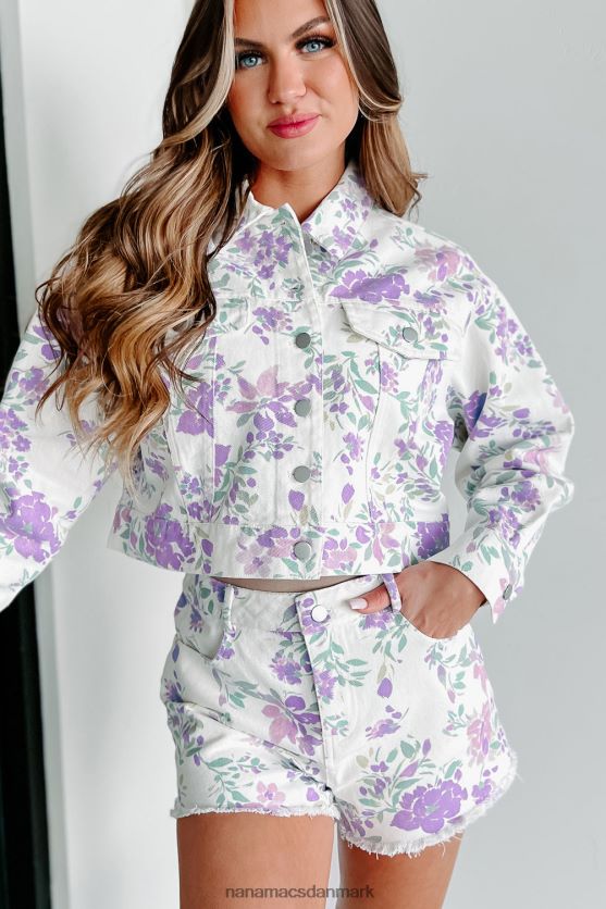 tjek denne stilfulde denimjakke med et unikt twist! dens slanke hvide og lilla palette suppleres af et iøjnefaldende blomsterprint, mens den afslappede pasform giver dig mulighed for at rocke den i komfort. en knaplukning foran og funktionelle brystlommer tilføjer ekstra bekvemmelighed, plus dens korte længde gør den perfekt til enhver sæson!