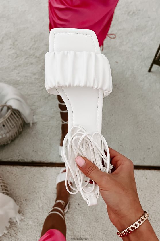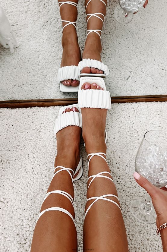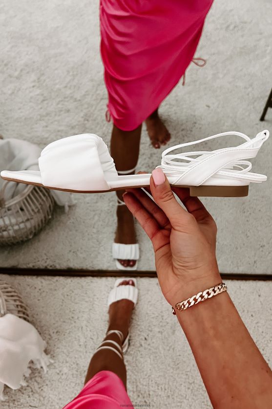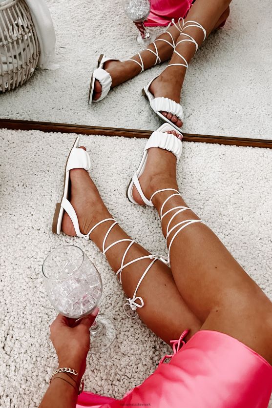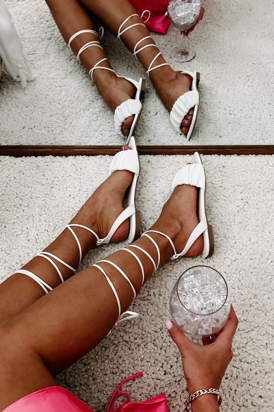 Disse flade, hvide sandaler er elegante, men afslappede, har en rynket rem, en firkantet tå og en ankelbind, bindelukning!