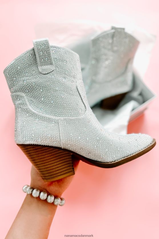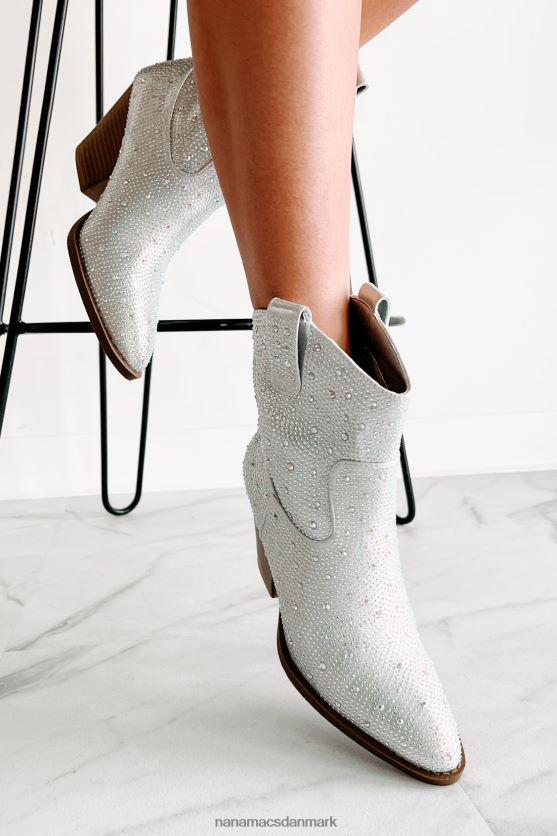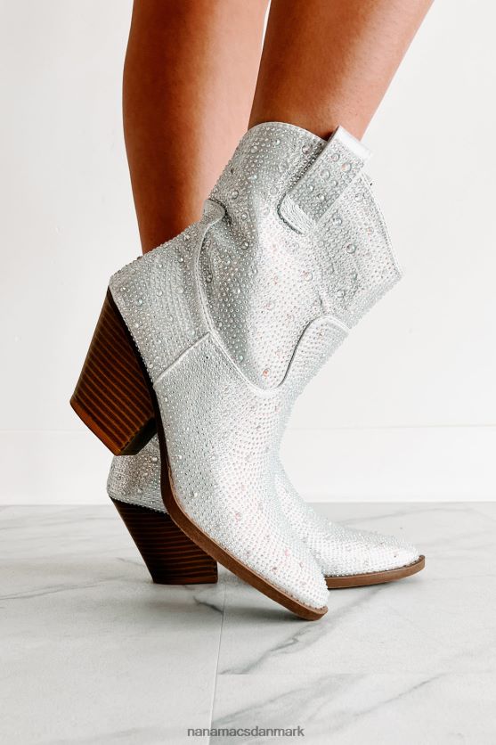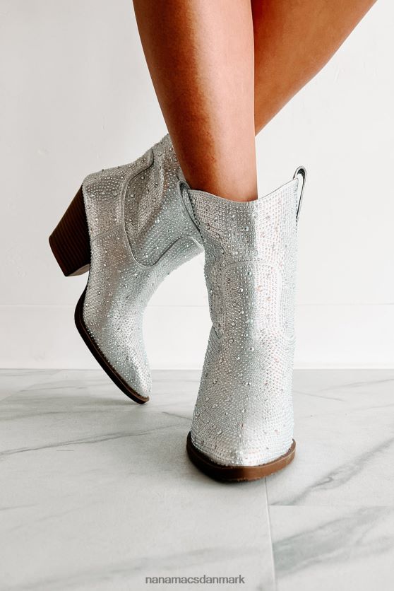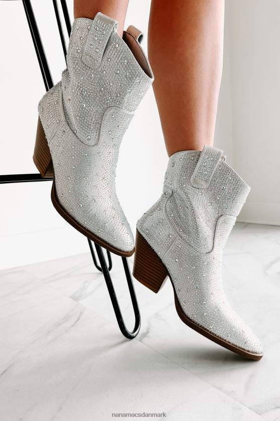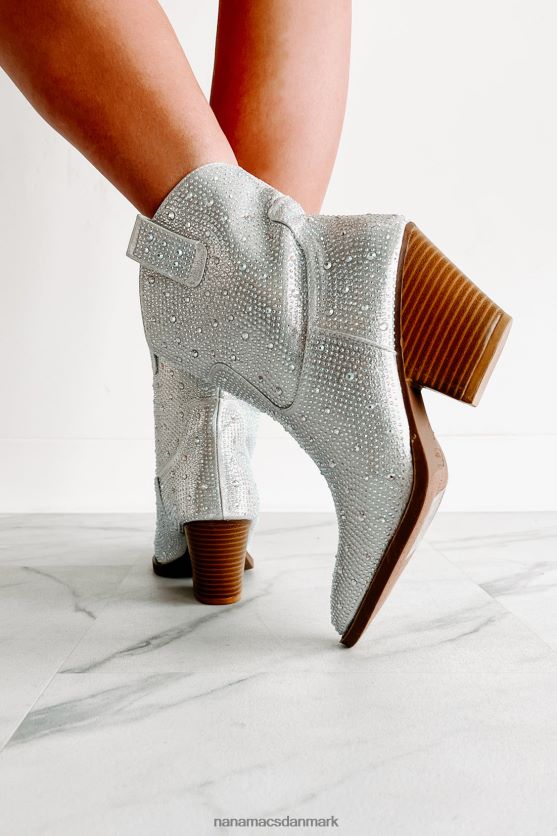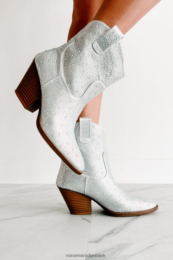 Træd ind i en verden af vestlig finurlighed med disse fantastiske sølvstøvler! udsmykket i glitrende rhinsten og afsluttet med sidetrækflige, vil de sørge for, at du skiller dig ud. en spids tå plus den klassiske, 3'' stablede hæl fuldender looket - perfekt til at gøre et uforglemmeligt indtryk ved enhver lejlighed!