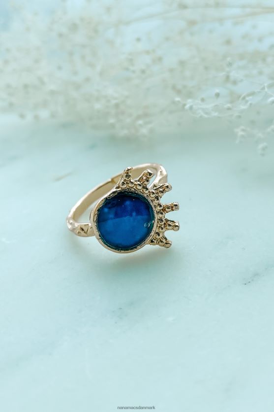 denne sjove guld statement ring har den perfekte pop af blå! p>jern, messing