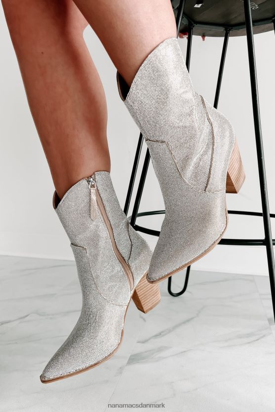 Træd ind i luksus med disse overdådige champagnefarvede støvletter. deres funklende rhinsten-beklædte overdel garanterer, at du vil være livet for enhver fest, mens en praktisk sidelynlås og spids tå holder dit look chik og sofistikeret!