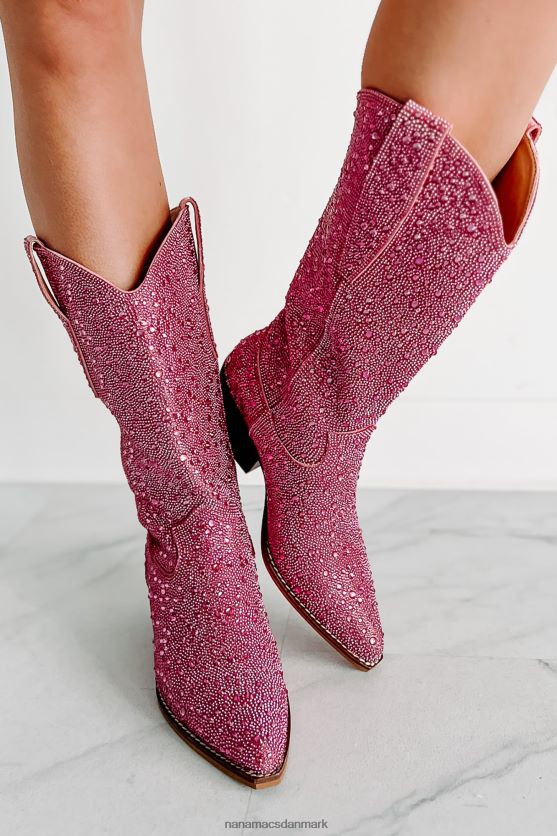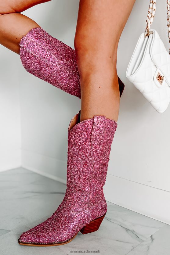 cowboy-stil får en moderne makeover med denne blændende lyserøde pull-on støvle! dens rhinstensudsmykning tilføjer masser af glitter og glamour, mens den firkantede mandeltå holder den klassisk cool!